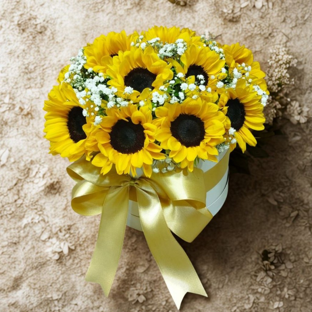 Lindo Arranjo na Box de Papelão na Cor Branca, com aproximadamente 12 Girassois mais ou menos, que podem variar de tamanho conforme a disponibilidade da época, mas que ficará lindo igual da foto.