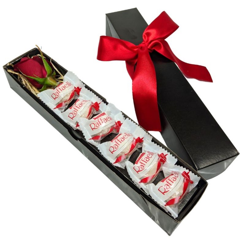 1 Rosa Vermelha com 6 Bombons Raffaello na Caixa com Tampa e Laço de Cetim.