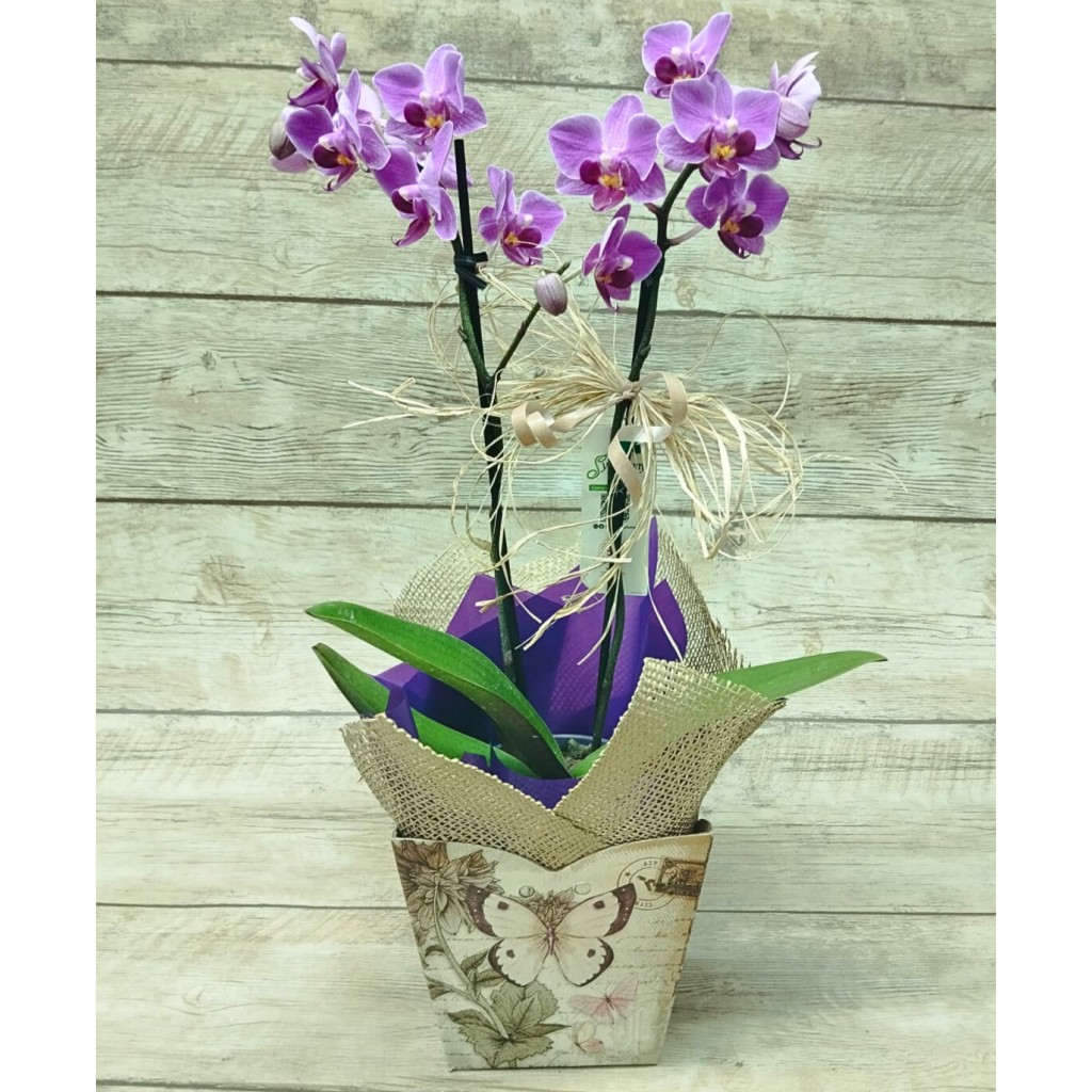Linda Mini Orquídea Phalaenopsis Pote 9 (aproximadamente 40cm) com 2 Hastes, em um lindo cachepô, embalada para presente.